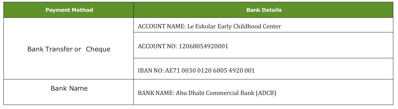 - Cheques to be made in the name of Le Eskolar Early Childhood Center.